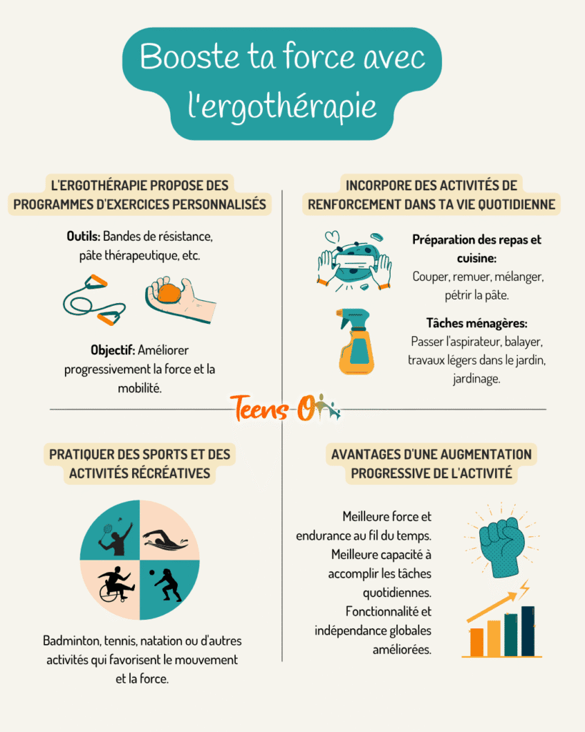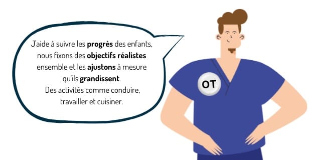 Un ergothérapeute peut t’aider à fonctionner au mieux possible à la maison, à l’école, au travail et dans les loisirs. L’ergothérapie peut t’aider à maximiser votre force, votre endurance et votre fonction physique. L’ergothérapie peut te rendre plus autonome dans vos activités quotidiennes. Au fur et à mesure que tu grandis, tu voudr as peut-être faire les choses par toi-même et trouver un moyen d’être indépendant. Les ergothérapeutes peuvent t’aider à trouver l’équipement, à modifier la tâche ou l’environnement ou les stratégies pour atteindre vos objectifs.