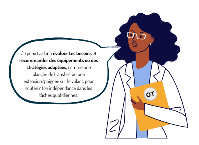 Un ergothérapeute peut t’aider à évaluer tes besoins et te recommander des stratégies et des équipements adaptatifs au besoin, comme une planche de transfert, une rallonge/bouton sur le volant, etc.