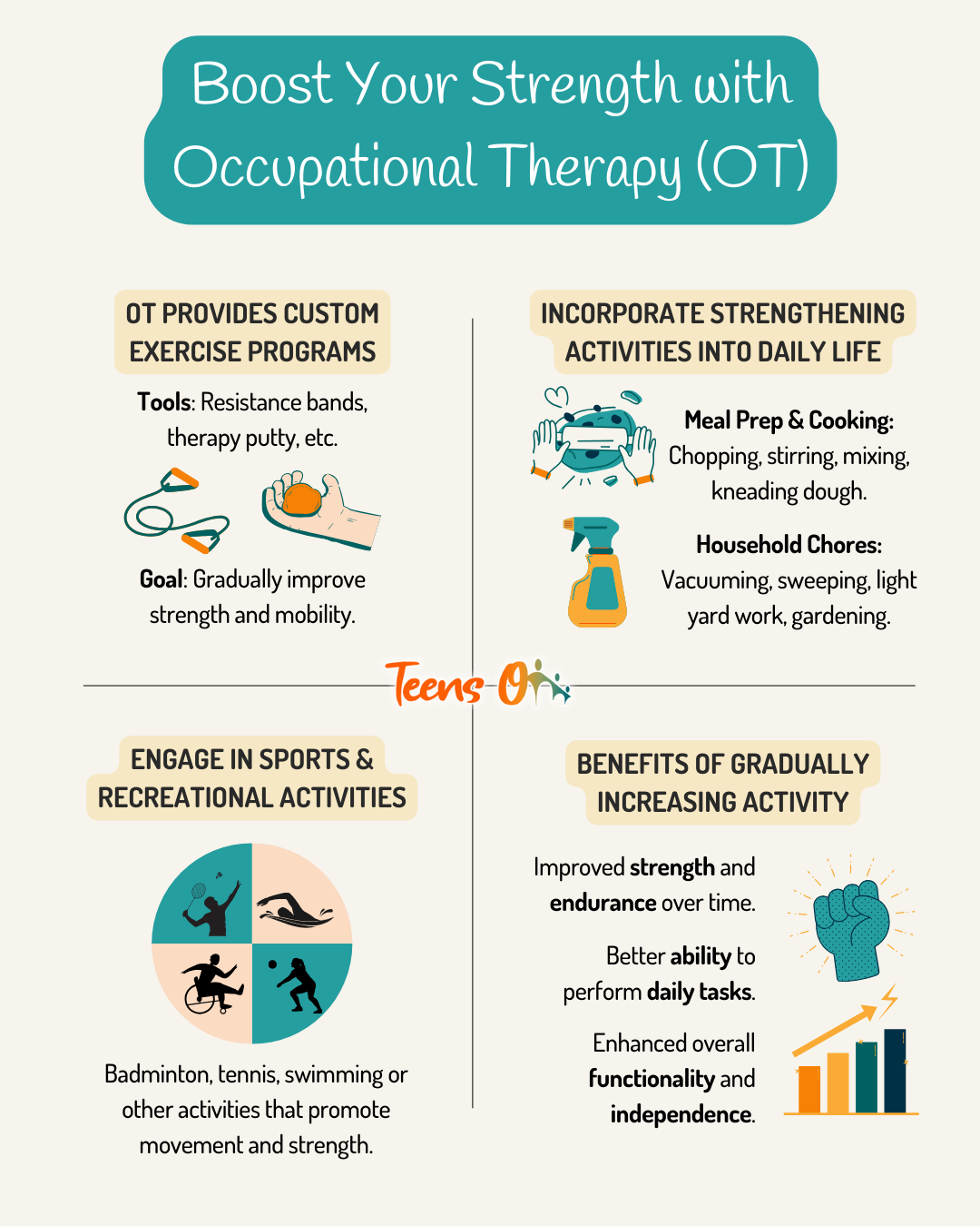 An occupational therapist (OT) can help you function your best at home, school, work, and play. Occupational therapy can help to maximize your strength, endurance, and physical function. Occupational therapy can make you more independent in your activities of daily living. As you grow, you may want to do things on your own and find a way to be independent. OT’s can help you find the equipment, modified the task or environment or strategies to achieve your goals.