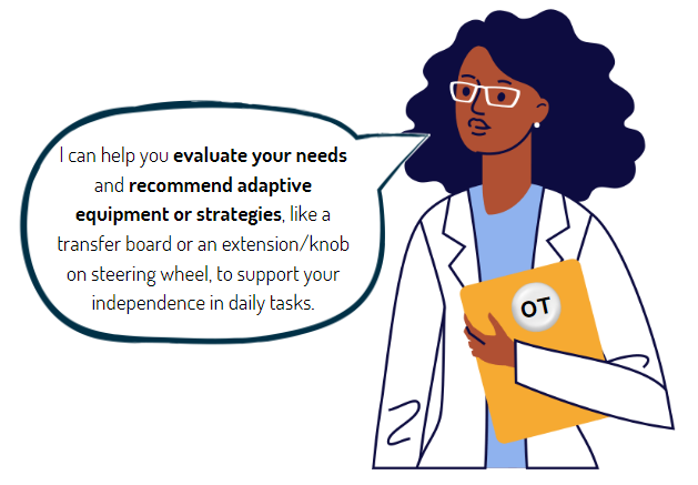OTs can evaluate the way you get from different surfaces and provide you with ideas, techniques or equipment to help make transfers you need a little smoother and as independent as possible.  The amount of assistance, equipment or modifications that you need may change depending on your fractures, surgeries, fatigue and pain. So it’s important to think about what you might need when you have a fracture, to have everything prepared so it’s ready to use if it happens.