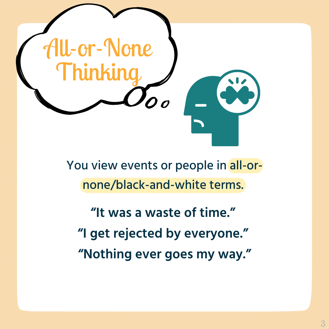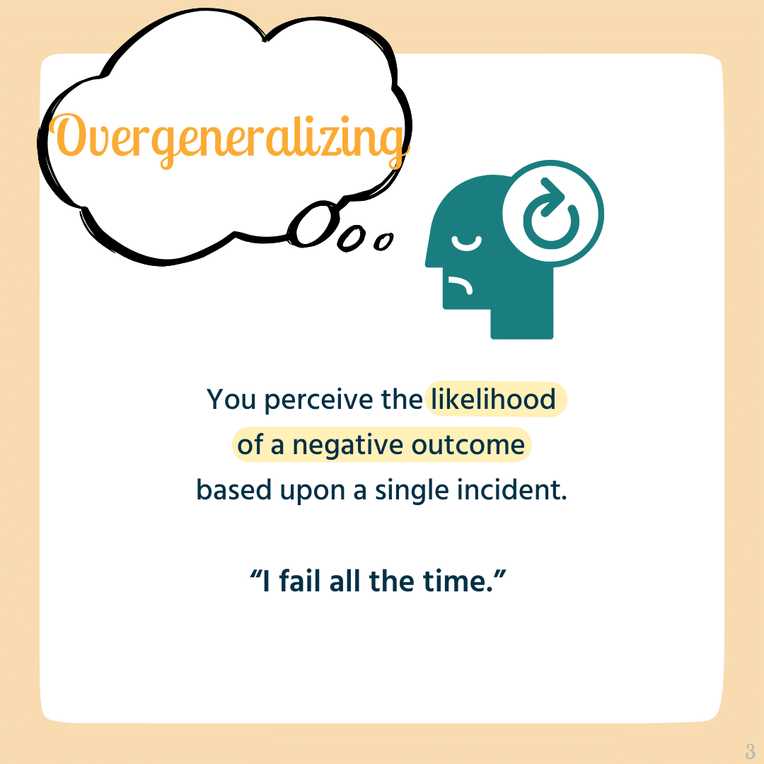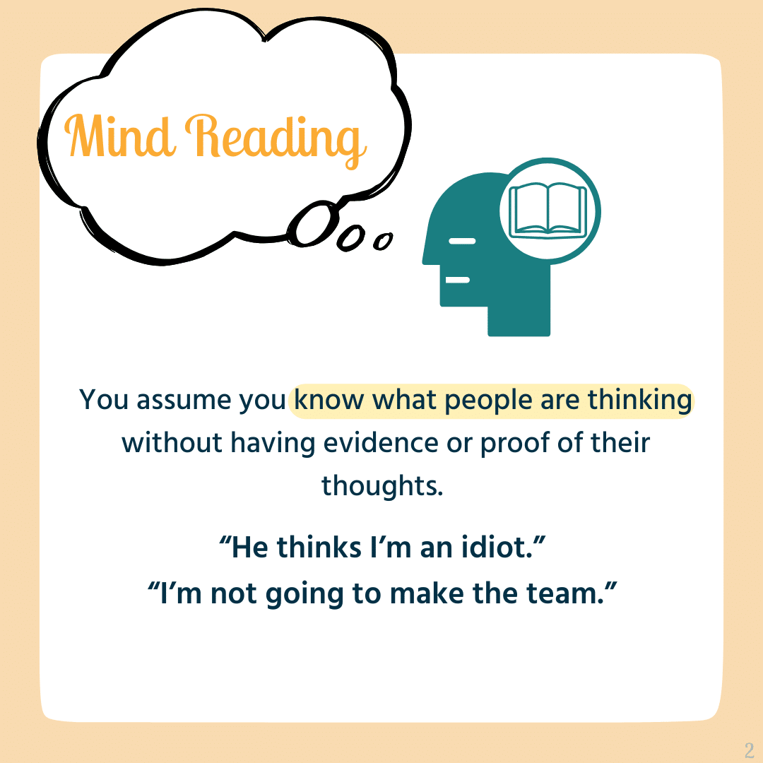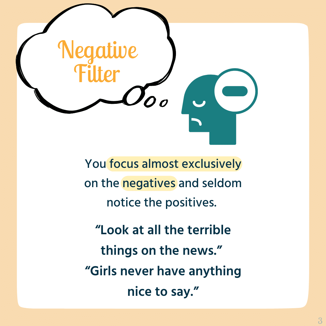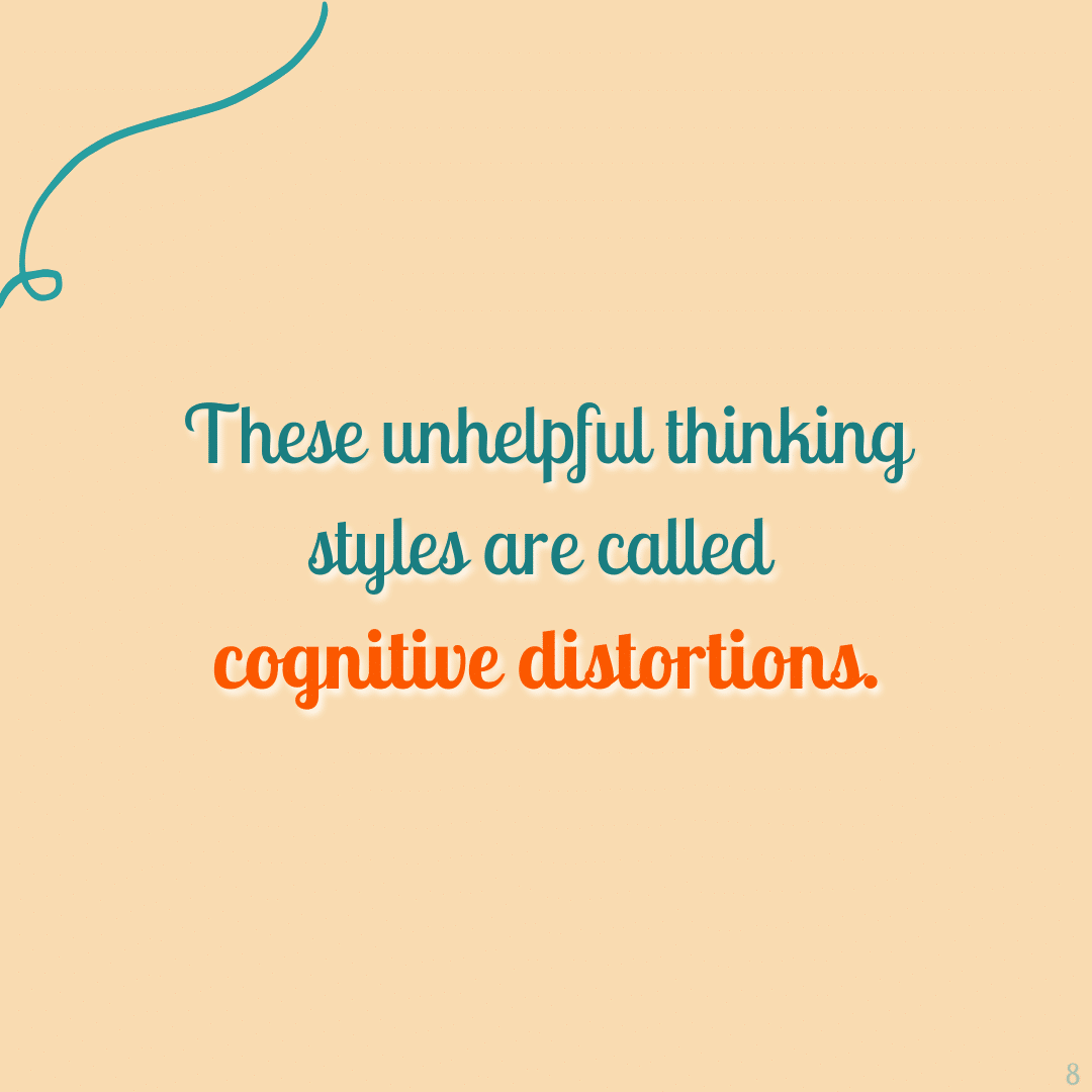 The way we think influences the way we see things. Our perceptions can be influenced by our beliefs and expectations. For example, if we assume the worse, we tend to see things as more negative than they really are. It does not matter if our thought is true or not, we believe it because it makes sense to us. These unhelpful thinking styles are called cognitive distortions.
