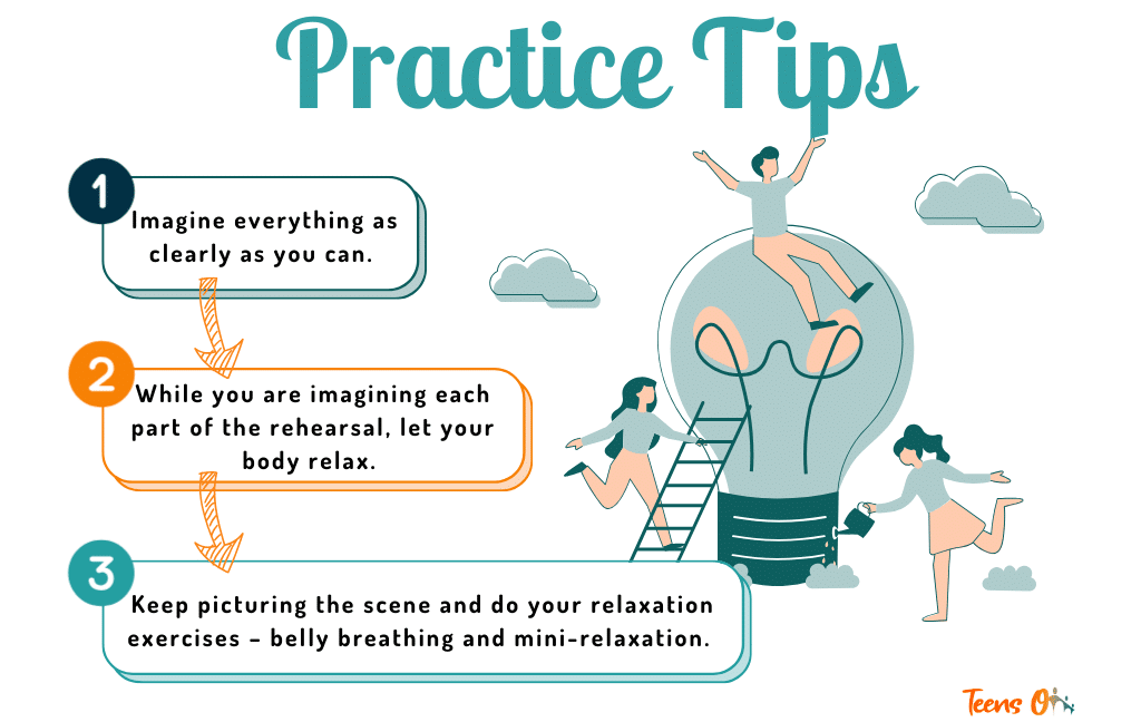 You know that even when you practice your lines you feel nervous. So, to prepare, set aside some time each day to rehearse the event. Imagine looking into a mirror and saying your lines. Picture yourself succeeding on each line. Don’t forget to relax as you imagine each part.