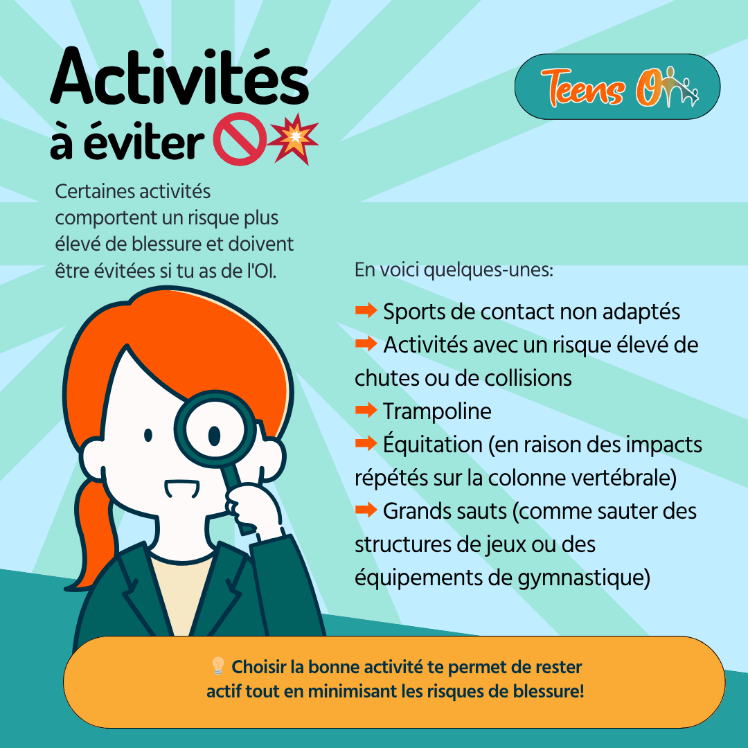 • Porte des chaussures avec un bon support à la cheville pour aider à prévenir les blessures, car l’OI peut rendre les articulations très flexibles.