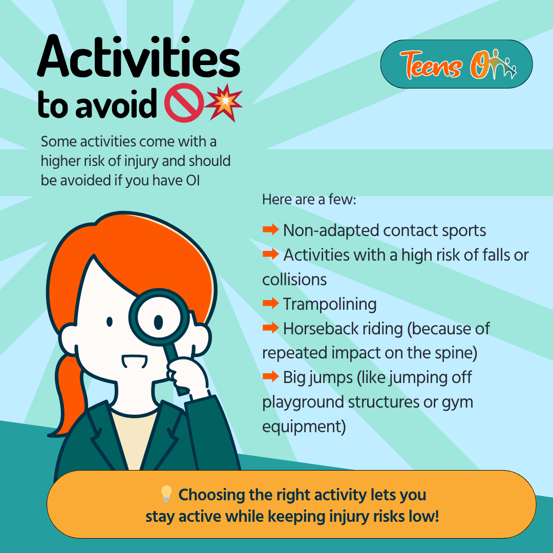 Consult a physician before starting any exercise program and a physiotherapist for adapted activities. Discussing with a physical education teacher about adapting sports for people with OI can also help!