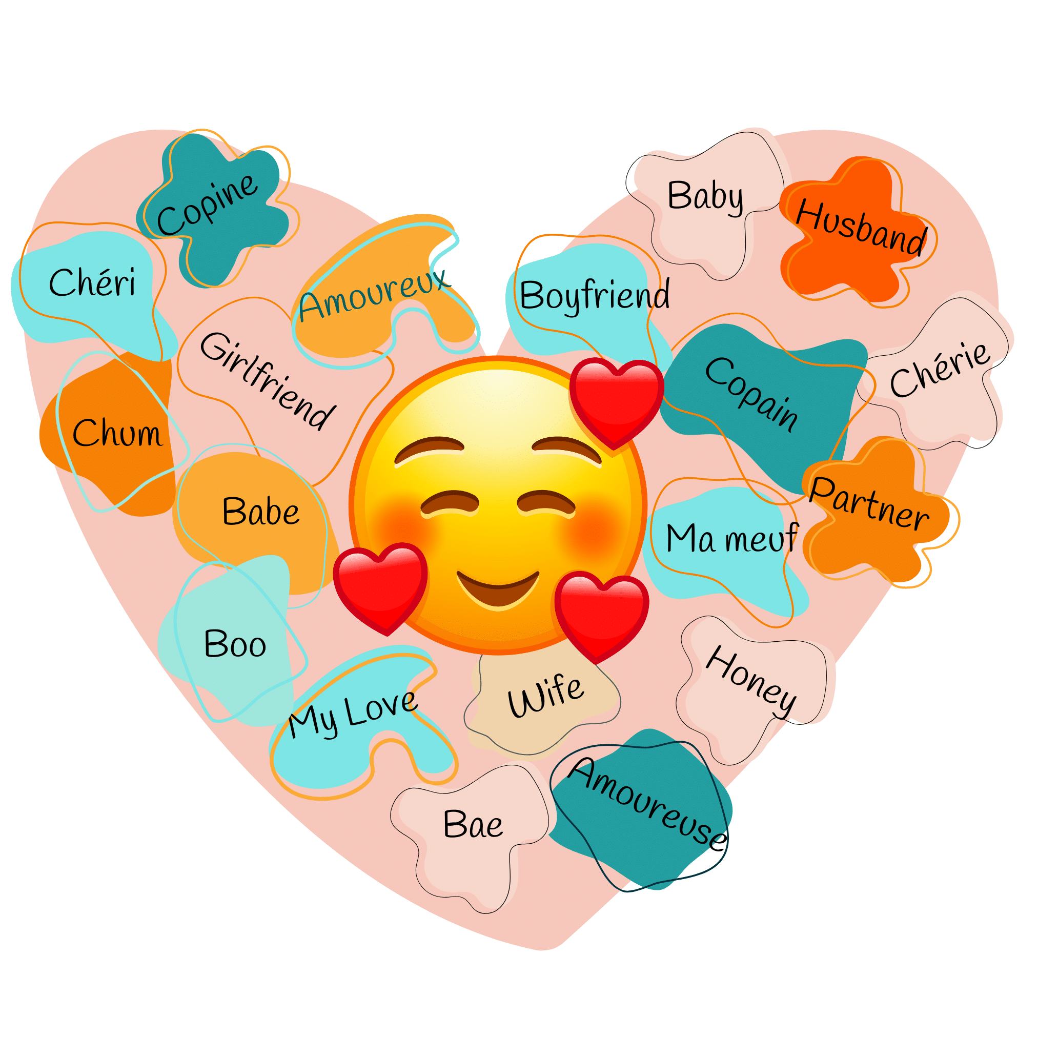 When you are not feeling well, it is important to let your family or partner know. It is always okay to ask for help when you need it. Your loved ones can make life easier for you when you aren’t feeling well.emoji with little heart and several synonyms for lover in English and French